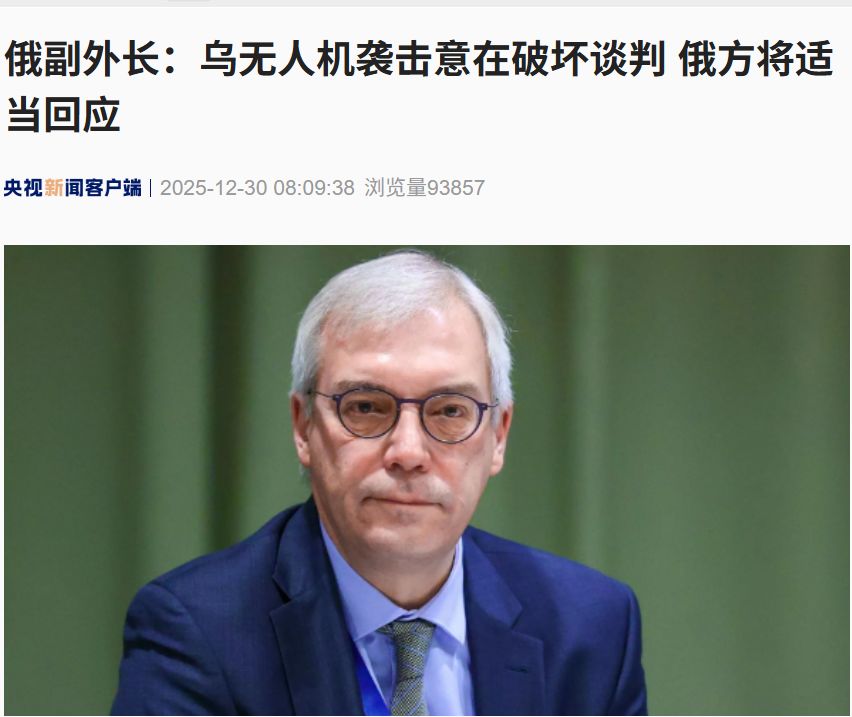 据央视新闻12月30日消息,俄罗斯外交部副部长亚历山大·格鲁什科当地时间12月29日在莫斯科表示,乌克兰用无人机袭击俄总统官邸,是破坏谈判进程、阻碍实现和平的危险尝试,俄方将作出适当回应。