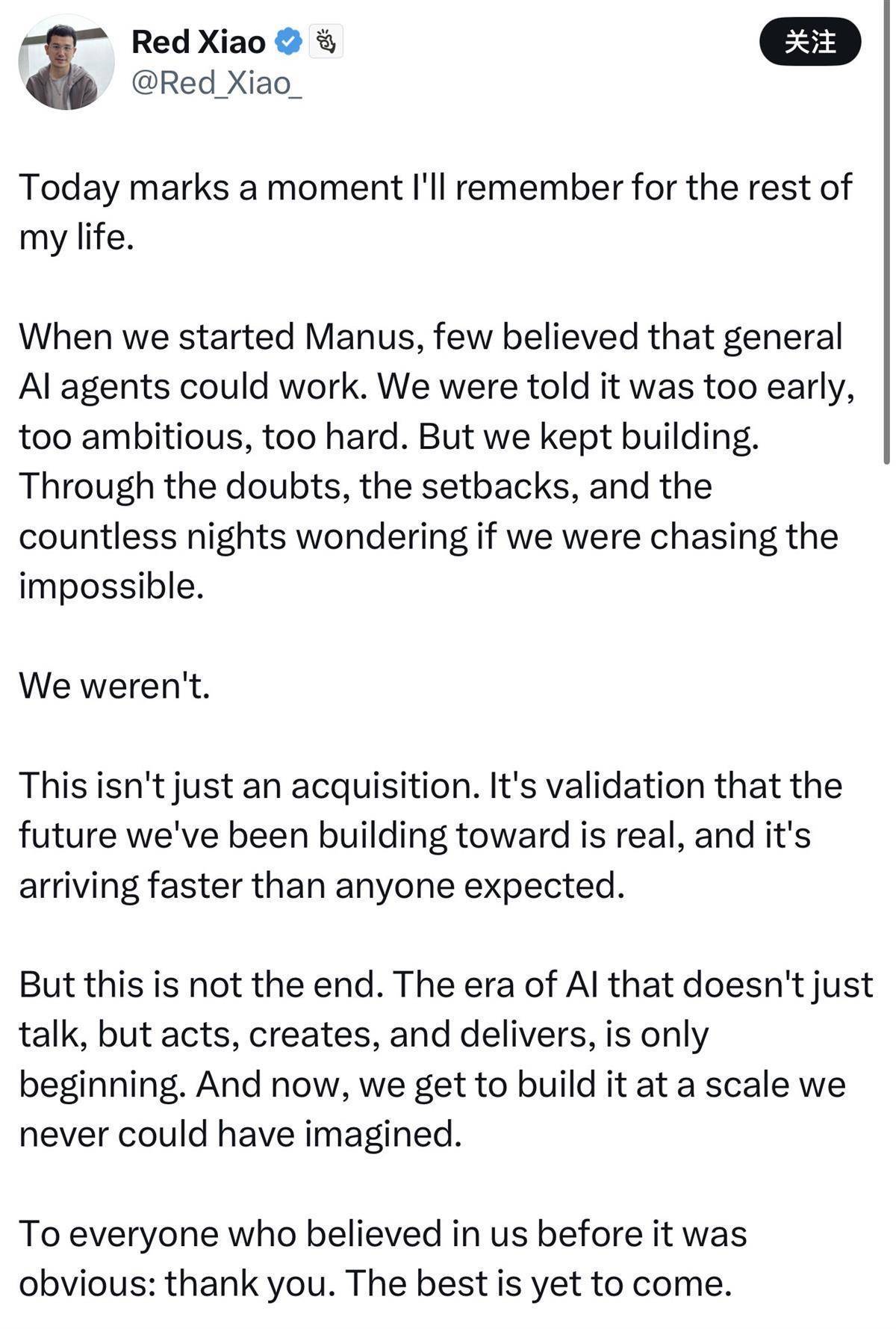 蝴蝶效应公司创始人肖弘用“终生难忘的时刻”形容这次收购。他说,团队创立Manus时,很少有人相信通用型人工智能体能够成功。人们质疑这项技术处于早期,Manus的目标太远、难度太大。“但我们坚持不懈地努力,克服了重重疑虑和挫折,以及对自身‘是否在追逐不可能完成的事’的怀疑。”