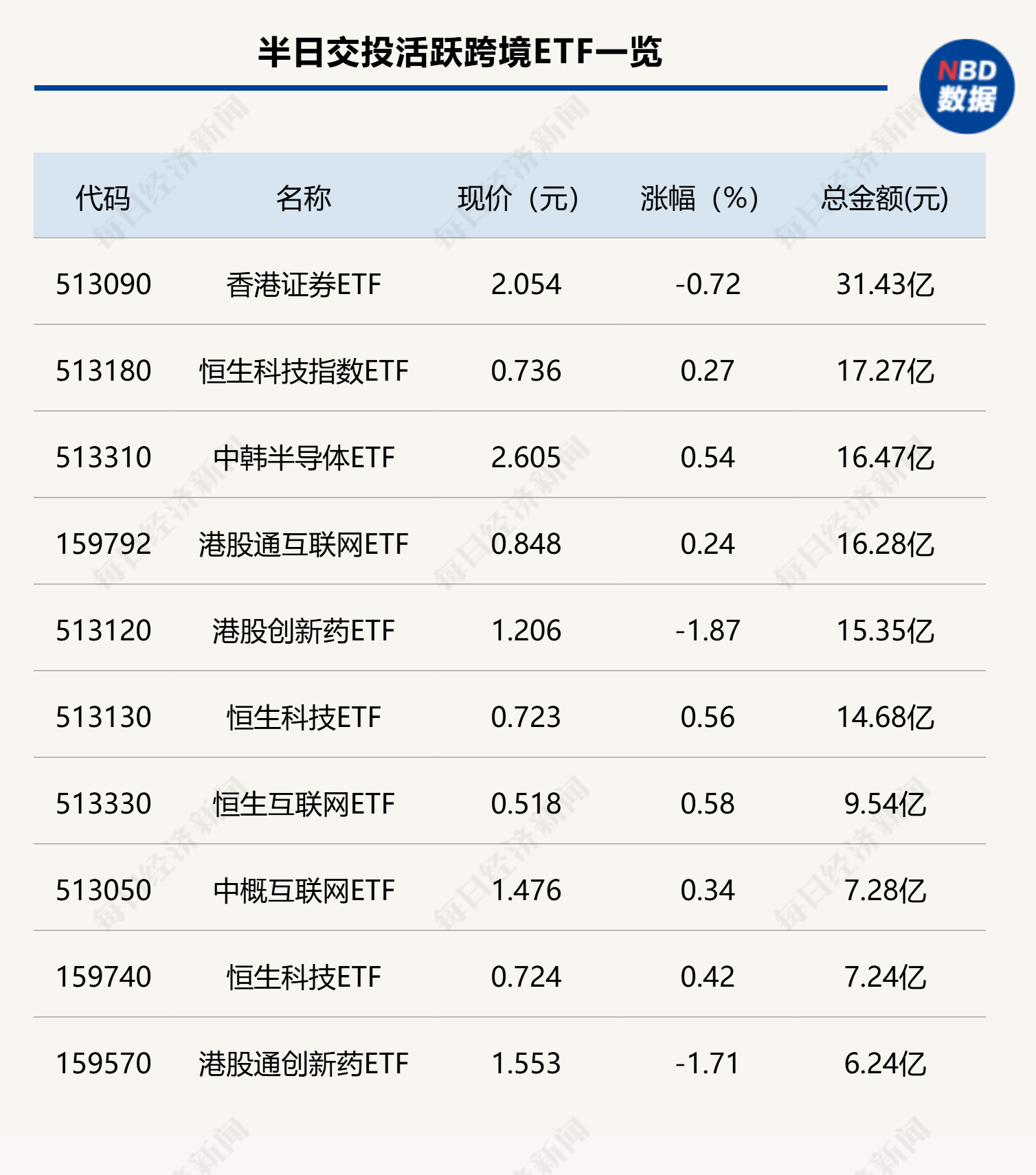 今日上午,ETF交投整体较为活跃,科创芯片ETF(588200)半日成交金额超过15亿元,两只有色金属ETF半日成交金额也超过10亿元,交易金额显著放量。跨境ETF方面,香港证券ETF(513090)半日成交31.43亿元,依旧是跨境ETF交易最活跃的品种。
