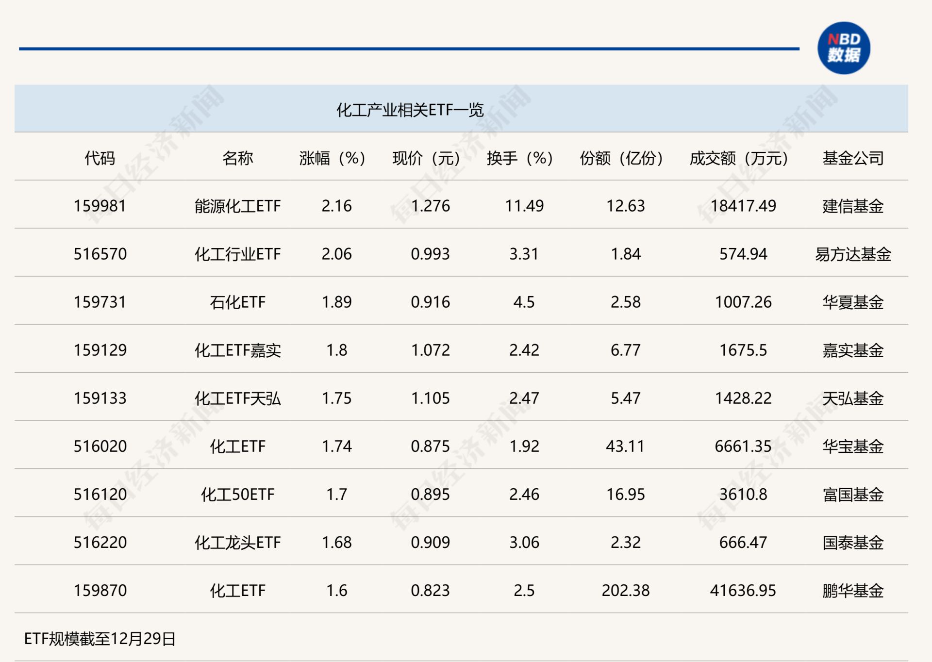 点评:化工ETF嘉实(159129)今日上午涨幅为1.8%,其份额为6.77亿份,半日成交金额为1675.5万元,该ETF追踪的是中证细分化工产业主题指数。追踪该指数的ETF还包括化工ETF天弘(159133)、化工ETF(516020)等。其中,化工ETF(159870)规模较大,其份额达到202.38亿份,半日成交金额为4.16亿元。