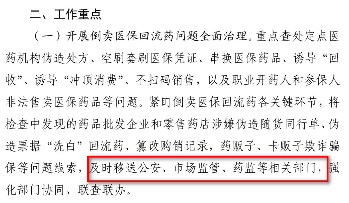 在强化部门协同中,国家医保局提到了公安、市场监管、药监等相关部门。图片来源:《关于开展医保基金管理突出问题专项整治“百日行动”的通知》