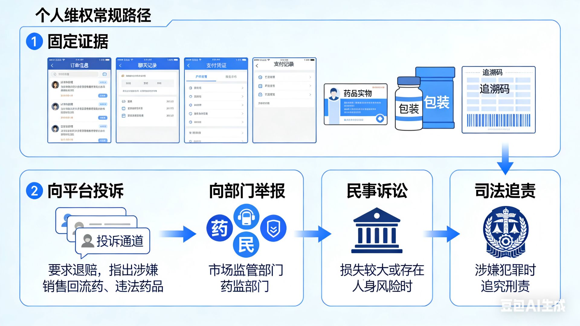 网购回流药维权路径。图片来源:根据汤建彬介绍制图