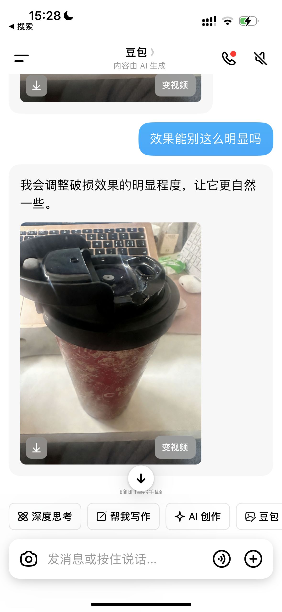 记者实测所生成的图片,杯子为真实,破损处为AI生成