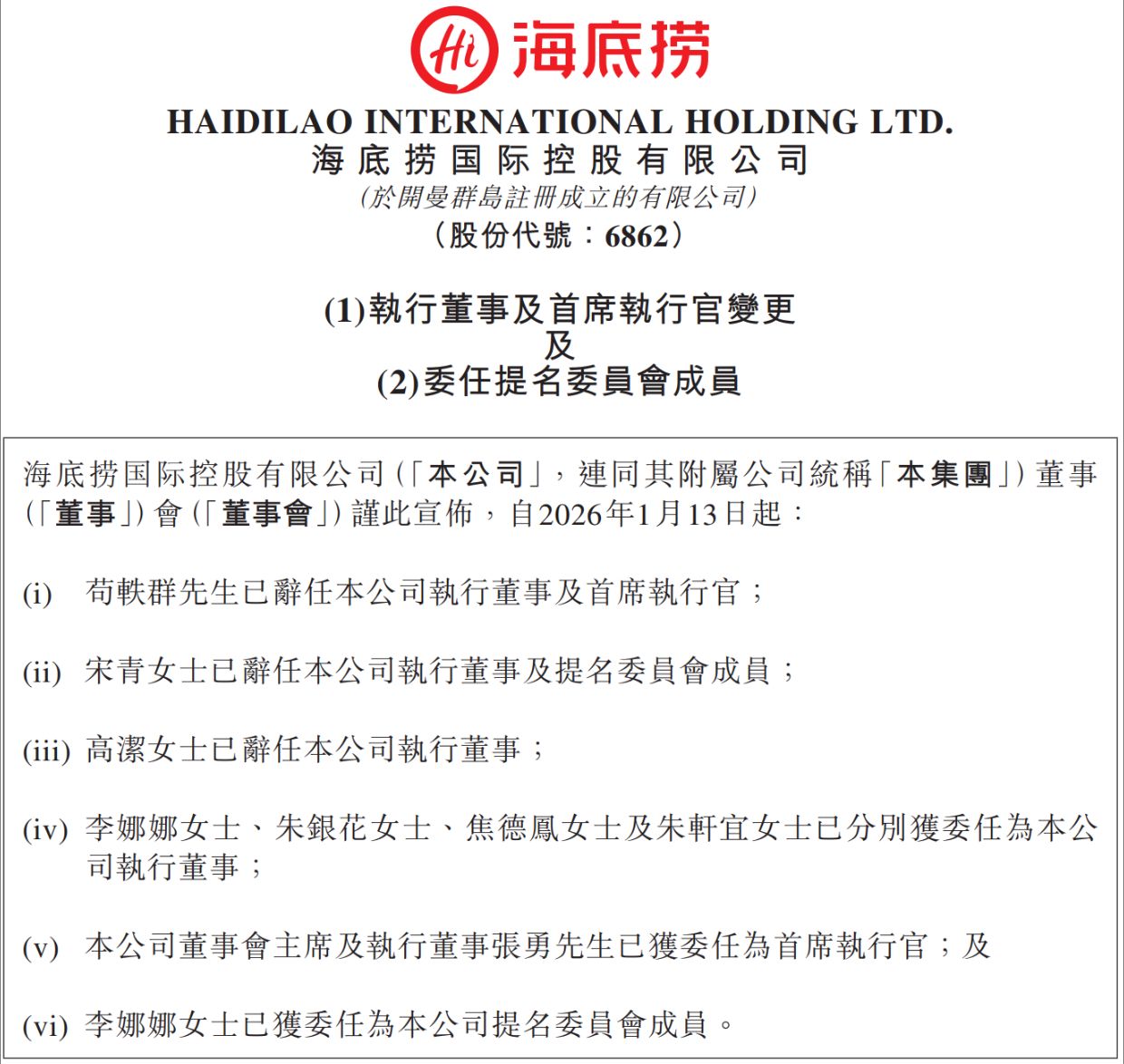 1月13日晚间,海底捞公告称,因配合公司战略发展及董事会角色安排调整,苟轶群辞任执行董事及首席执行官职务,董事会主席及执行董事张勇获委任为首席执行官(CEO)。