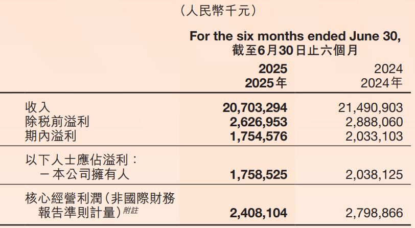 财务数据显示,2025年上半年,海底捞实现营业收入207.03亿元,同比下降3.7%;净利润17.55亿元,同比下降13.7%;核心经营利润为24.08亿元,同比下降14.0%。
