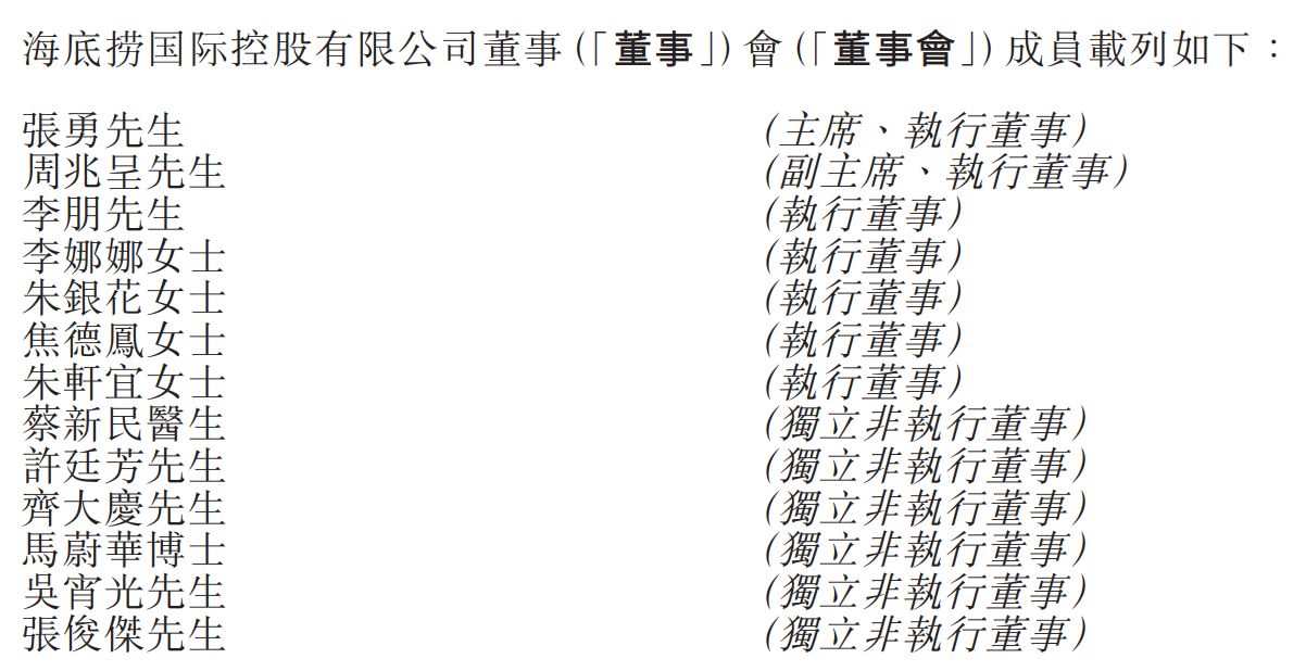 不难看出,此次调整,海底捞董事会有意在人员构成上更加贴近门店运营、区域管理与产品决策等场景。海底捞在公告中表示,董事会认为委任新董事将带来新视野和新动力,有助于提升董事会效率,并支持公司在未来发展阶段维持高标准的企业管治。