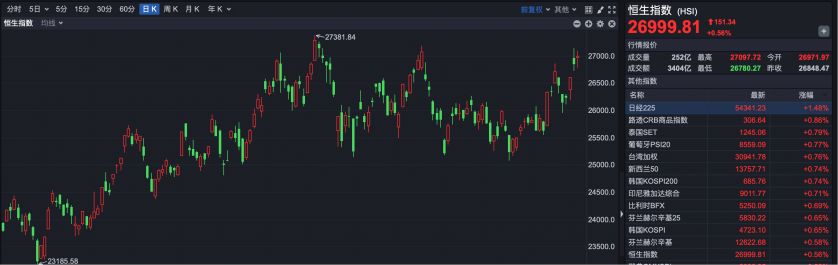 截至收盘,恒生指数报收26999.81点,上涨151.34点,涨幅0.56%。港股全天成交3404亿港元,较昨日继续放量。