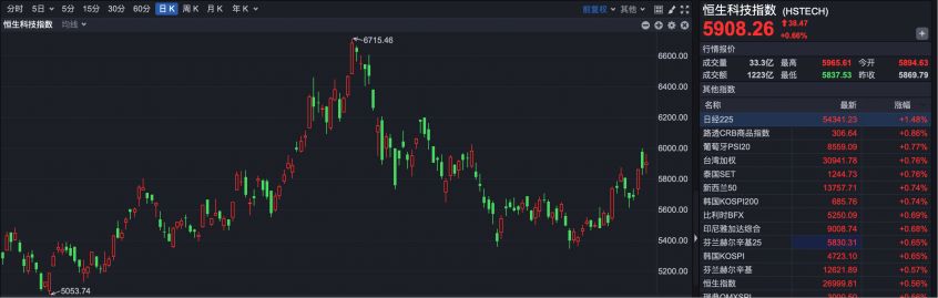 恒生科技指数报收5908.26点,上涨38.47点,涨幅0.66%。