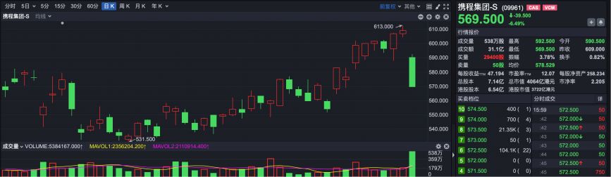 市场焦点方面,携程集团-S(HK09961)大跌6.49%。而就在昨日,携程集团刚刚摸到港股上市以来的新高,最高报613港元,今日收盘报569.5港元。