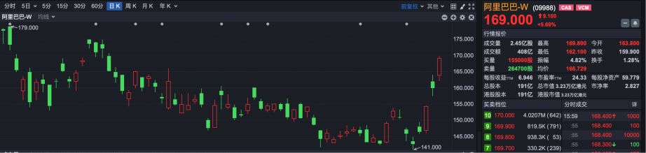 阿里巴巴-W(HK09988)继续维持强势,今日大涨5.69%。