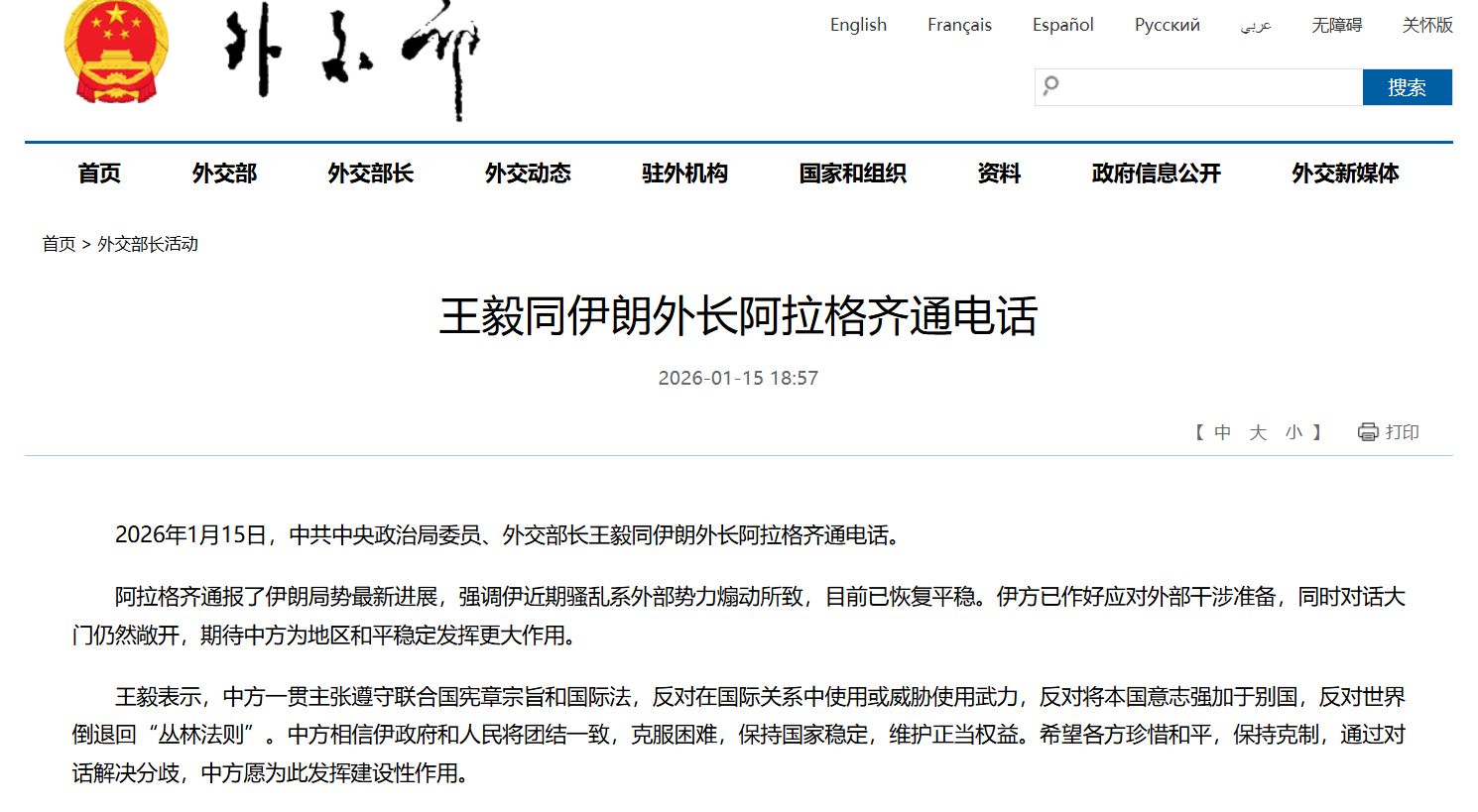 阿拉格齐通报了伊朗局势最新进展,强调伊近期骚乱系外部势力煽动所致,目前已恢复平稳。伊方已作好应对外部干涉准备,同时对话大门仍然敞开,期待中方为地区和平稳定发挥更大作用。