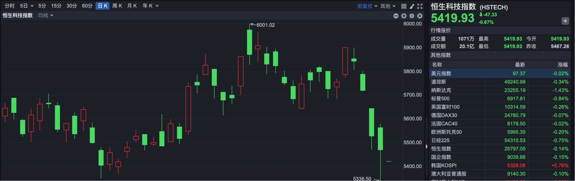 恒生科技指数开盘报5419.93点,下跌47.33点,跌幅0.87%。