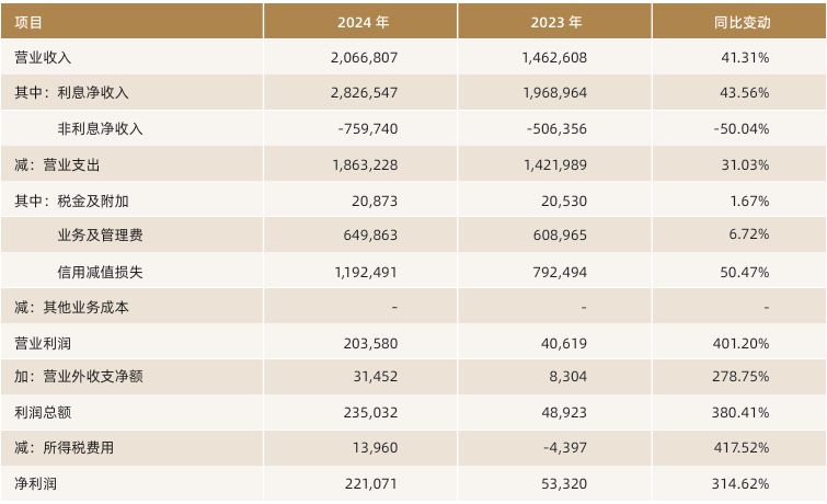 盈利方面,该行近年来保持高速增长,2024全年实现营收20.67亿元,同比增长41.31%;实现净利润2.21亿元,同比大幅增长314.62%。