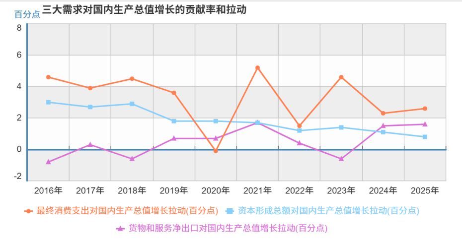从最近10年来看,在中国经济的三驾马车中,消费对GDP(国内生产总值)的贡献地位提升、结构优化,尽管波动明显,但已成为经济稳定运行关键支撑。2025年最终消费支出对GDP增长拉动达到2.6个百分点。