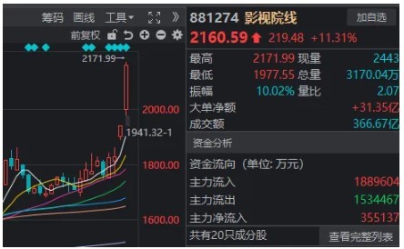 同花顺数据显示,影视院线板块单日大涨11.31%,Sora概念、短剧游戏、文化传媒等板块纷纷跟涨。