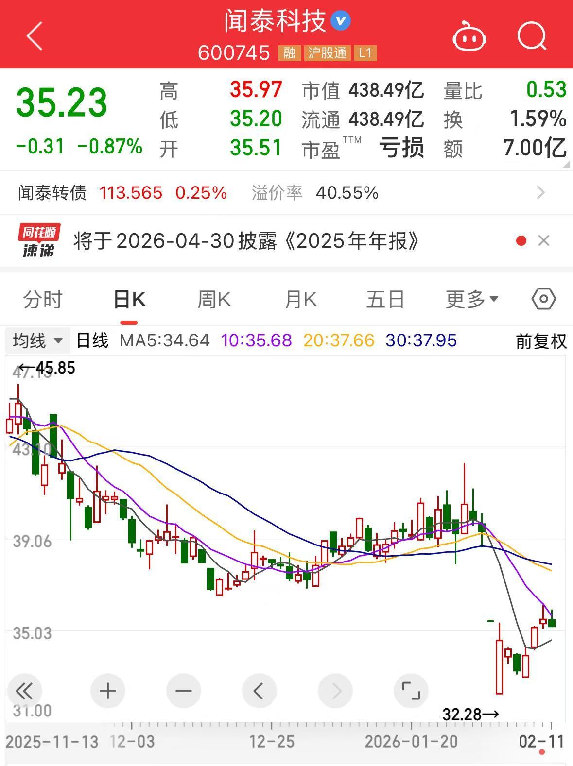 盘面上,截至收盘,闻泰科技股价跌0.87%,报35.23元,市值438.49亿元。