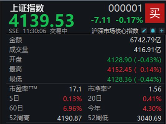 2月27日,A股弱势整理,创业板指跌逾1%。截至上午收盘,上证指数跌0.17%报4139.53点,深证成指跌0.68%,创业板指跌1.46%,北证50跌0.74%,科创50跌0.66%,中证A500跌0.49%,A股半日成交1.6万亿元。