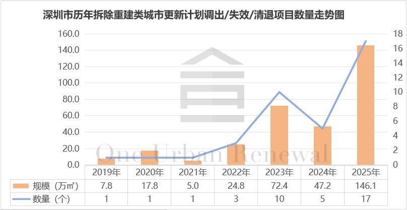 据合一城市更新统计,截至2025年12月8日,深圳已计划调出、失效、清退城市更新项目共计38个,涉及拆除范围约321万平方米。其中,2025年全市计划调出、失效、清退城市更新项目共计17个。