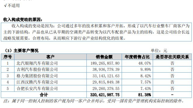 公司从废旧纺织品加工起家,中途跨界进入汽车天窗领域,格力电器、北汽银翔汽车有限公司(以下简称北汽银翔)、奇瑞汽车都曾是其第一大客户。2024年,公司对奇瑞的销售额占比超过八成。