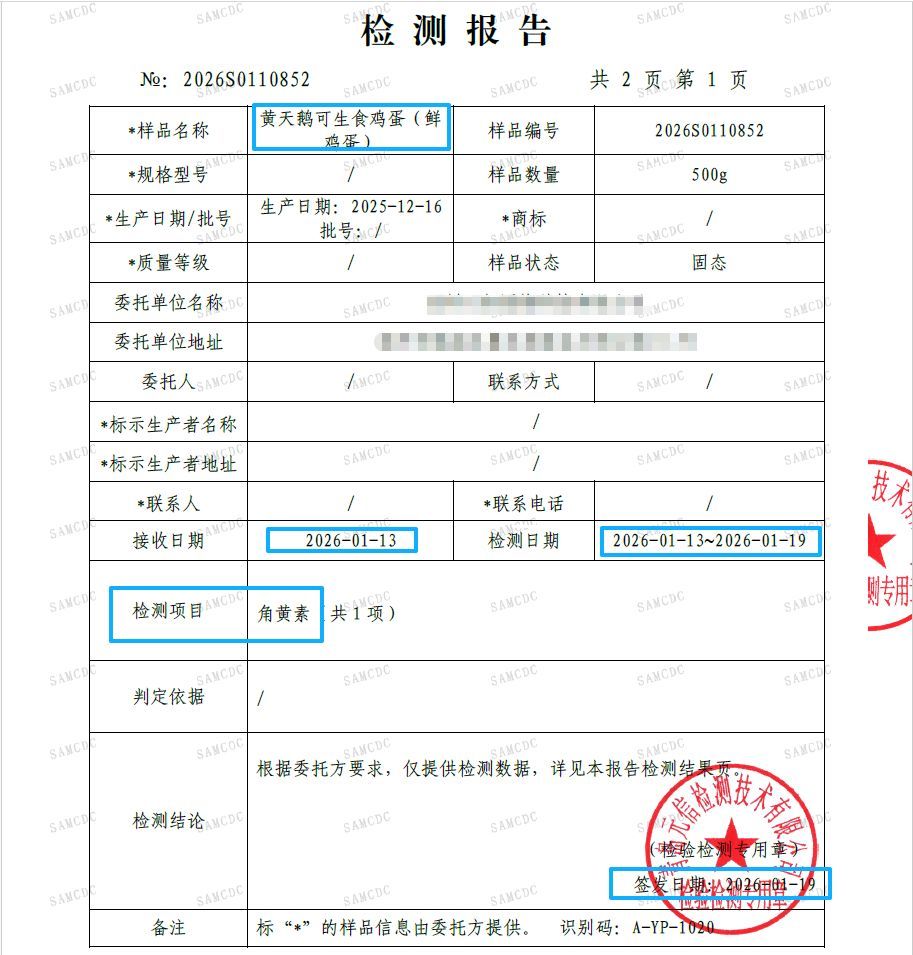 记者查阅黄天鹅公布的检测报告发现,四份报告分属不同检测机构:四川盐亭县市场监管局委托四川振兴检测、宁夏固原市原州区农业农村局委托山东拜尔检测、浙江长兴县市场监管局委托浙江公正检验中心,企业自检则委托梅里埃检测技术有限公司。检测品类均为黄天鹅可生食鸡蛋,生产日期集中在3月15日至17日,角黄素检测结果均为“未检出”。其中,宁夏原州区的报告明确备注“确认产品属于上市产品”。