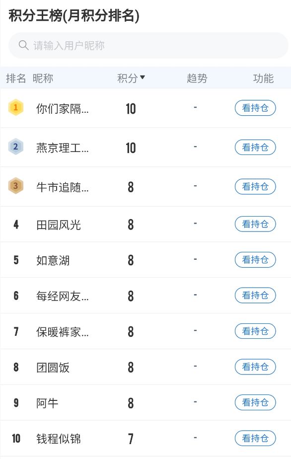 从3月的月度积分王来看,第一名和第二名选手积分达10分,第三名选手积分达8分。根据比赛规则,当月度总积分相同时,以当月最后一期比赛的收益率进行排名,前100名选手都将获得现金奖励。